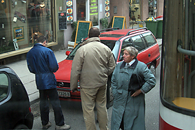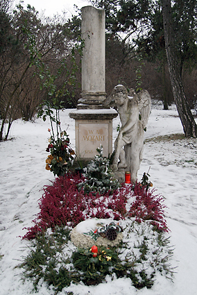 中央墓地に続きザンクト・マルクス墓地(モーツァルトが埋葬された墓地)を訪れた。こちらは墓参者の人影もなく、寒々とした様相。カラスだけが我々を迎えてくれた。丘の上にひっそりと佇むモーツァルトの墓標が印象的であった。その後が大変、第3のハプニングに見舞われることになる。シューベルト最期の家に急ぐ我々の路面電車とベンツのタクシーが接触事故を起こしたのだ。おまけにタクシーは駐車中のオペルとも接触、ミラーをもぎ取ってしまった。路面電車が停車して5分後にはオペルのドライバーが荷物を抱えて戻ってきた。警察や市交通局の役人も駆け付けて、辺りは大混雑、交通整理の笛も鳴りだした。そうこうするうちに後続には4本の路面電車が立ち往生しているではないか。缶詰のまま25分経過でようやく復旧して動きだしたのだが、シューベルト最期の家とシュテファン寺院は諦めざるを得ない状況となってしまった。