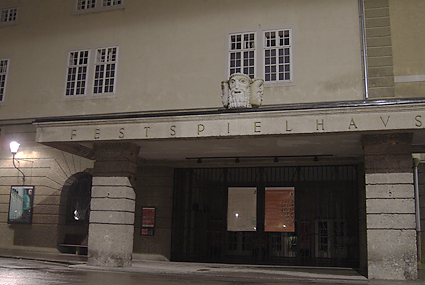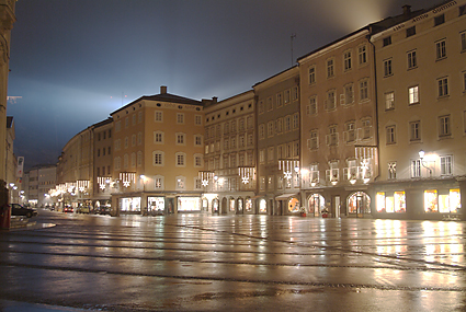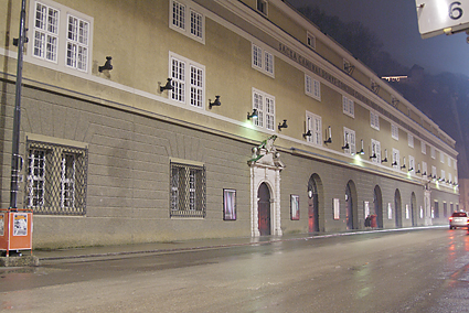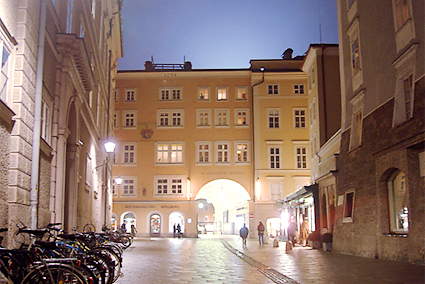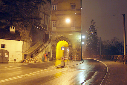 旧市街を目指してSteingasseを南東へ向かう登り道。 下りを快適に散歩すると右手の山腹に教会が見えてきた。 西の山手に教会を見上げる。 岩盤をくり抜いた道を振り返る。 またまたトンネルだ。 サウンドオブミュージックで有名な「馬洗い池」。 背景の岩もライトアップで幽玄な姿で迫ってくる。 続いて現れたのはFestspielhavser祝祭劇場、サウンドオブミュージックで音楽祭が行われたフェルゼンライトシューレはこの中にある。 祝祭劇場の入り口、入れないのが残念。岩盤をくり抜いたホールの響きをいつか味わいたいものだ。 祝祭劇場の向かいにはコレーギエン教会が見える。 旧市街の中心部を通ってゲトライセガッセへ抜ける。 まだ午後6時だというのにゲトライセガッセも人影がまばらだ。 一際明るい場所に近付いていく。 フランツィスカーナ教会。 レジデンツ北側の広場、大聖堂も目前のはずだ。