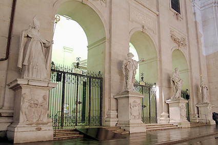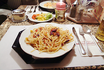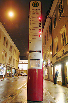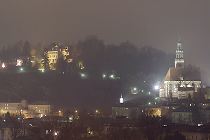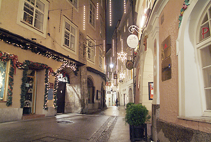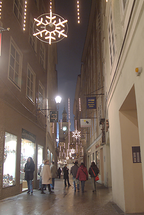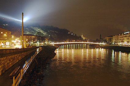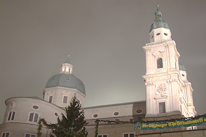 突然現れた雄姿。ザルツブルクでこれまでに通ってきた教会とは大きさが格段に違う。ようやく今晩の目的地、大聖堂に至ったのだ。入り口には明日の朝にはクリスマスのミサが11時から行われると書かれている。楽しみにしていよう。7時を回ったゲトライセガッセは、殆どの店が閉まっている。クリスマスイブは外でなんて考えるのは日本人だけなのか。家庭の暖かな部屋で極く親しい人達(家族)とイエスの誕生をお祝いするのが一番いいのかもしれない、と妙に納得する。それでもショウウィンドウを見ながら夕食場所を探す。やっとのことで見つけたのは、たった1軒だけ開いていたピザ屋だった。腹ペコで迷わず中に入るも、店内はアメリカ人観光客でごった返している。何でもいいや!と勢いで頼んだチリ・スパゲッティ、これが最悪のティストだった。パスタはヨレヨレで喉を通らず作り立てとは思えない。麦酒もそこそこに退散する。夜の探索もここまでか。シュターツ橋からザルツァッハ川を渡り旧市街を後にした。バスでホテルに帰っても、まずい夕食の憂さばらしに夜景を撮影、イブの夜は歩き回った疲れで意識の外に遠ざかっていったのだ。