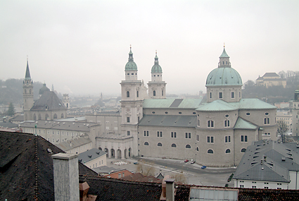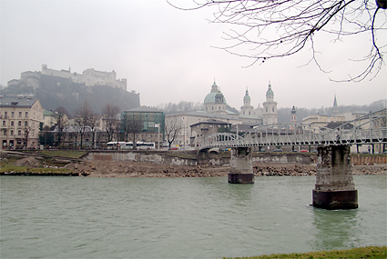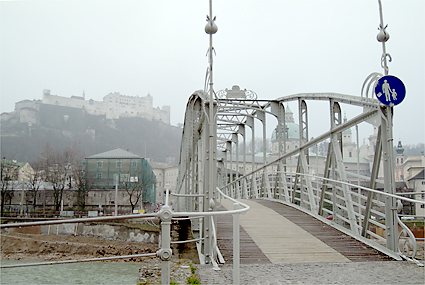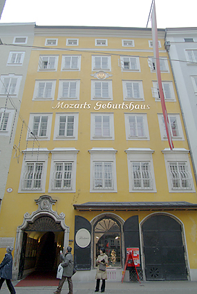 東側の受付を出ると何度か散歩中の地元の方と擦れ違った。きっと春には緑豊かな森が芽吹くのだろう。木々が静かに通り過ぎていく遊歩道。秋の名残、落ち葉が朝露に濡れていた。下界に降りてくると、まず渡りたかったモーツァルト小橋。サウンドオブミュージックでハイキングのシーンとして使われた橋だ。そういえば何処かしら見覚えがある。カーテンで作った服を着た7人の子ども達が思い出される場所だ。橋を渡って旧市街を眺めていると時間の経つのも忘れてしまう。おっと10時を過ぎた。回れるだけ回ろう。何はともあれモーツァルトの生家だろう。ゲトライゼガッセ沿いを早朝に歩いた折りに閉まっていた扉は、ようやく開けられていた。中に入るとかまど周辺は当時のままが再現され、1756年この家の4階で誕生したモーツァルトが今でも出てきそうである。1773年までここで暮らしていたのだ。この街が誇る天才の足跡を垣間見た。