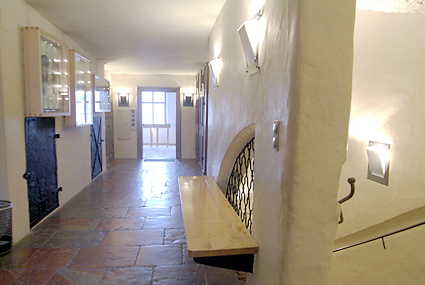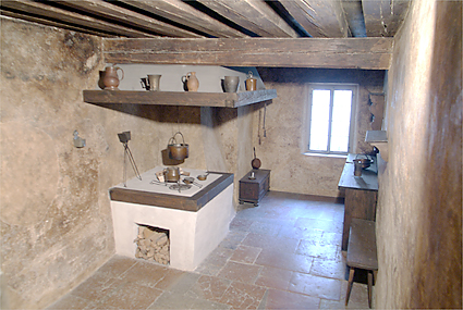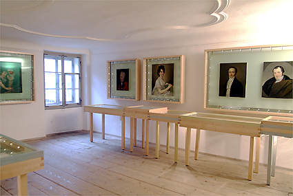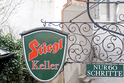 ホーエンザルツブルク城とも分かれ、 少しずつ旧市街に降りてきた。 四季を通じて自然と仲よくできる遊歩道が続く。 シュティーグルケラー(レストラン)の看板。 遠くにモーツァルト小橋が見えてきた。 これは渡らずにいられようか、ザルツァッハ川対岸から城を見上げる。 河畔のベンチで一休み、時間が止ったような気がした。 一人でモーツァルトの生家に向かった。扉は開けられていたのだ、一安心。 ひたすら階段を昇る。 台所は当時のままだ。 数多くの資料が展示され、 一家の肖像画や自筆譜を見ることが出来た。 ゆっくりする暇もなく10時に待ち合わせ場所のレジデンツ広場を目指し、 生家を後にしたのだった。