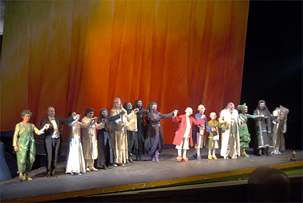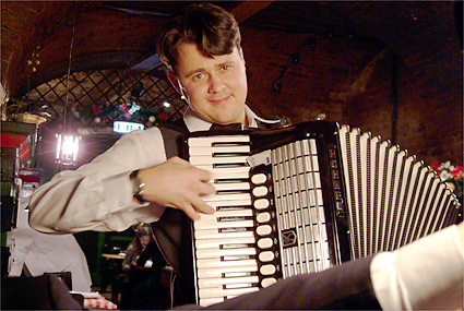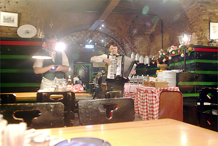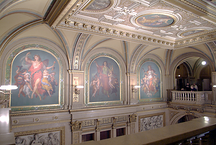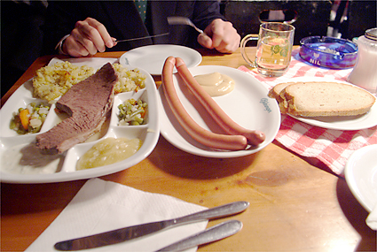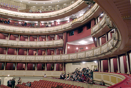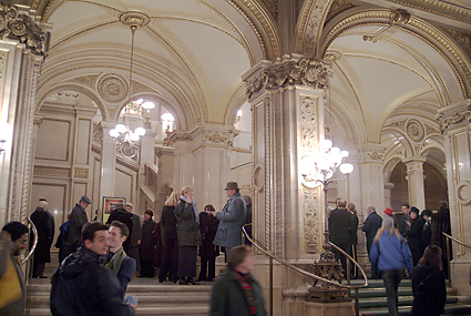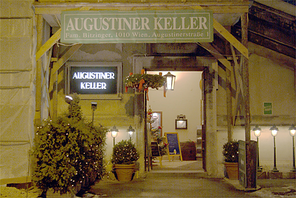 ザルツブルクから帰ったのは午後4時台であった。K.K.マリアテレジアに戻って一息入れる。いよいよこれから天下のウィーン国立歌劇場へ向かうための英気を養うためだ。少々疲れも溜まりつつあって、今晩の目標は「居眠りをしないこと」に決める。開演の7時に先駆けて会場に到着、入ると同時にエントランスロビーに感激。しかし人が多い。階段前には案内人が立ちはだかって上には時間まで上げてくれない。オーバーコートで客席まで上がれるようだ。いくらかシャッター(もちろんノーフラッシュ)を切ったところで制止される。周囲ではフラッシュをバンバン焚いて記念撮影をしているではないか。仕方なく指示に従ってカメラを一旦ポーチに収納。複雑な階段や通路を迷いながらまず最上階に上がってみる。場内は派手な装飾はなく、落ち着いた雰囲気であった。今晩、筆者の席は下手2階のボックスで前列である。ボックス席は2列になっていて前列は据え付けられていない椅子が3つがある。後ろには高めの椅子が2つ置かれている。目の前のコンソールを開けると液晶で「ようこそウィーン国立歌劇場へ」と案内が表示されている。今晩のStefan Solteszの演出は象徴的な枡目の板に囲まれた舞台で繰り広げられた。奴隷達が動物に変身していることや3人の童子が現代風の衣装であること以外はオリジナルの時代背景に基づいているものだった。演奏そのものよりも雰囲気を楽しんだと言うのが適当だろう。終演後に歌劇場のホールスタッフマネージャーらしき人物にポスターを頂けるようお願いをした。快く分けてもらえたことが嬉しかった。我々以外にも同じくポスター目的の人達は数人いたようである。歌劇場を出たのは10時過ぎ、オペラのある日は遅くまで開いている飲食店との情報どおり、街はいつもよりネオンが残っている。アウグスティナーケラーに赴いた。ケラーとは地下室の意味で、ワイン貯蔵庫を居酒屋にしたような店である。アウグスティナーケラーは歌劇場の裏手にある。ご覧の料理とワインで23ユーロなり。幸運にもアコーディオンの演奏にも出会えた。彼のサービス精神旺盛な演奏は「さくらさくら」「上を向いて歩こう」と、我々の素性を把握して次々と続く。こうなればチップを弾むしか手はなかった。程々に満腹で心地好くなった我々はシュトラーセンバーン(路面電車)でホテルに帰ったのだった。今日もまた超ハードな旅程でオペラ鑑賞目標の「居眠りをしないこと」は実行できなかった。