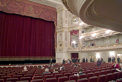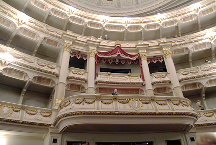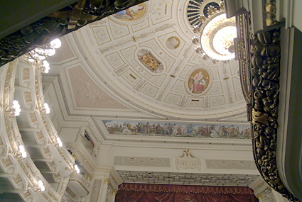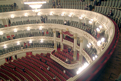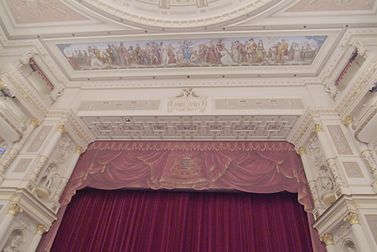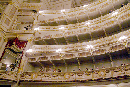 ザクセン州立ゼンパー歌劇場に到着したのは7時過ぎ、丁度1幕が終わったところであった。ゼンパー歌劇場といえばウェーバー・メンデルスゾーン・ワーグナー・R.シュトラウスなどの活躍の場となったが、特にワーグナーはタンホイザーをここで初演している。到着後に筆者はオーバーコートをクロークに預け(無料)場内を歩きながら撮影を続ける。女性の係員から「写真を撮るなら2ユーロでこのチケットを」と求められ、言うとおりに購入した。この話は以前に聞いていたので抵抗はなかった。かえって気が楽になったというものだ。ホールはウィーン国立歌劇場よりも豪華に見えたが、2点の気になることが目についた。一つは舞台の外幕が描かれたものである(本物の生地ではない)こと、あと一つは客席上部のシャンデリア回りが破損している点である。しかし美しく立派な歌劇場であることには疑う余地がない。