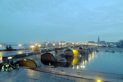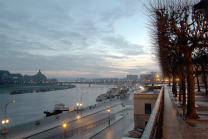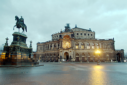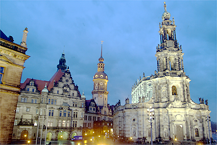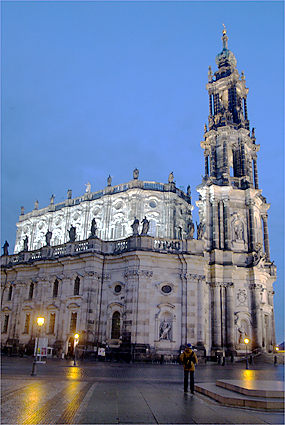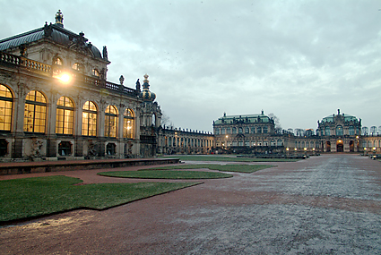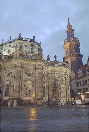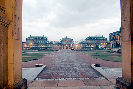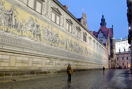 旅行も5日目を迎えた。早朝のドレスデンを散策し、昨夜の道を辿ってみた。早々にヒルトンをチェックアウト、前の通りを滑り止めの石を踏み締めながら壁画「君主の行列」を時代とは逆に眺めていく。空が明るくなり始めドレスデン城にも次第に光が差すようになってきた。エルベ川は先の洪水で氾濫し、ドレスデンの街も少なからぬ被害を被ったという。もっと驚くことにはヒルトン前の建築現場は何をしているのか確かめてみれば、教会を修復しているそうである。それも第2次世界大戦の連合軍による空襲でメチャメチャに飛び散った石を丹念に積み重ねていく作業を今日でも続けているとの話に感動する。歴史への敬愛と街の再生にかける市民の誇り高い気質を垣間見た。バロック様式の壮麗な建築群は、このように守られて次代に継承されることへ一介の旅行者としても安堵の気持を感じながら歩いていた。ゼンパー歌劇場を通り、程なくツヴィンガー宮殿が見えてきた。