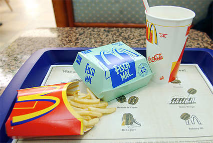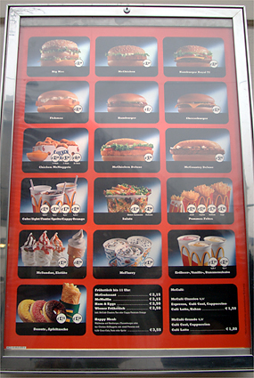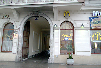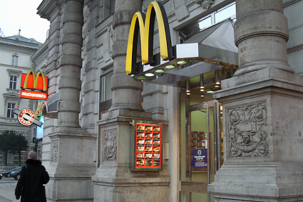 バスクァラッティハウスから市電2でSchwedenplatz駅、地下鉄U1でドナウ運河を渡り、Nestroyplatz駅で下車した。J.シュトラウスの住居を訪れるためだ。ここで時間は12時30分、そろそろお腹が空いてきた。記念館も昼休みで閉館中。J.シュトラウスの住居横がマクドナルドである。ウィーンに来てまでマクドナルドでもなかろうとは思ったのだが、30分後には記念館が開くことも考えて隣の店に入ることにする。魚を食することが極端に少なくなっていることに気付き、FishMac(日本ではフィレオフィッシュ190円)を注文。2.5ユーロである。因にハンバーガーは1ユーロ(約127円)と、デフレスパイラルに陥った日本の59円とは大きく値段が開いていることを実感する。ウィーンではパスタ系のファーストフード店やサンドイッチ店など日本の都市よりも種類は多い。その中でマクドナルドを選んでしまったのは単に見慣れたロゴに安心感を得たからなのだろう。味もそこそこ、同じに決まっている。やはり違ったシチュエーションを楽しむべきだったのか、疑問が残った。