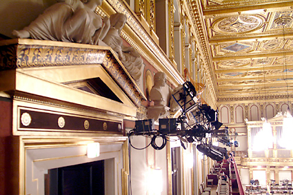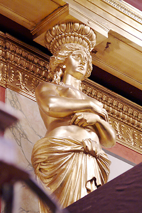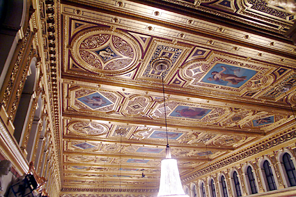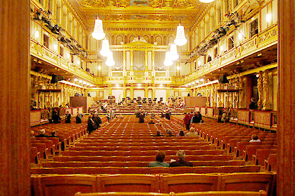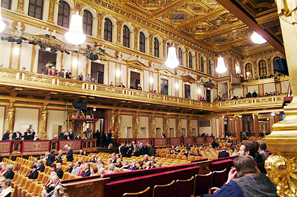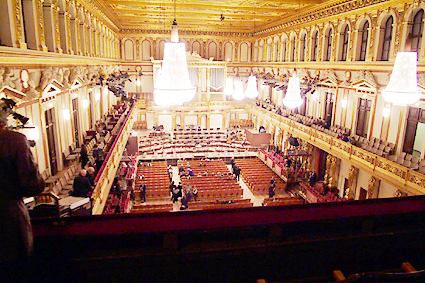 流れに従ってホール客席へと進んだ。ニューイヤーコンサートの中継で馴染みの深い豪華絢爛たる内装である。今晩はトーンキューストラ・オーケストラによるジルベスターコンサートである。J.シュトラウスやレハールの作品が演奏される。最後は恒例のラデッキー行進曲で締めくくられる。ホール内部は最良の音響を得られる木造で金箔が施されている。床は2重構造にされて床下に共鳴箱を持っている。地下に流れているウィーン川の大きな坑道がもう一つの共鳴空になっている。天井は中吊りにされ、これも共振するように造られている。120年以上弾き込まれたバイオリンの名器のような芳醇な響きを醸すことができるのはこのような構造上の特徴によるものだ。