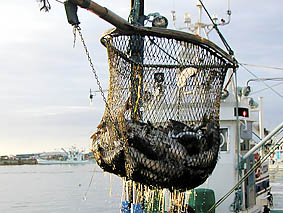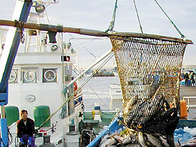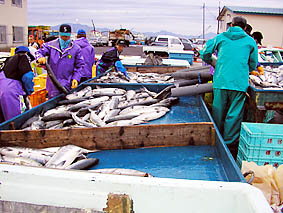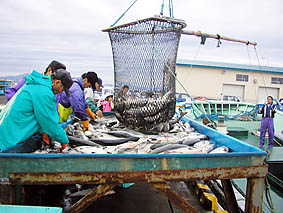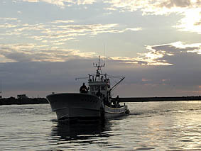 堂々たる雄姿が日の出を従えて 次々と帰ってきた 船倉にはアキアジがいっぱい 早速水揚げ作業が始まる 船倉にも網にも多くは入れない 大切なアキアジを傷つけないためだ 細心の注意を払って選別台に移される 一次選別されたアキアジは塩ビパイプを通って さらに細かな選別をされる 種類ごとに氷で温度管理された水槽(鮮度保持タンク)に保管される ←前へ もどる↑ 次へ→