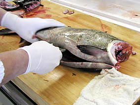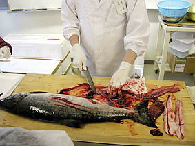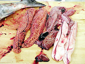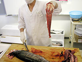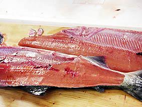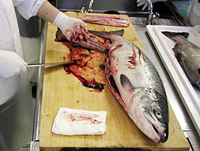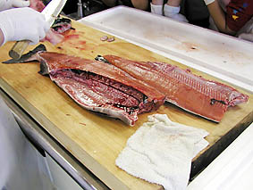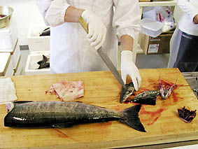 標津町文化ホールは旧国鉄の標津駅跡地に建設されている 朝に水揚げされたばかりの鮭に早速 包丁を入れる まずは腹部から内蔵を出す スジコ(イクラの固まり)を丁寧に取り出す 左からスジコ・内蔵・白子、中央前は心臓 氷頭(ヒズ)= 鼻の軟骨を取る 二枚におろし始める 背骨に沿って包丁が進み 見事に解体された 鮮度抜群のツヤは関西で見ることが難しい