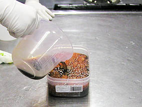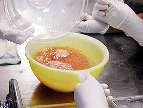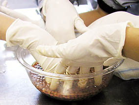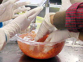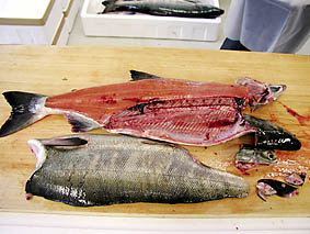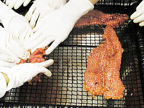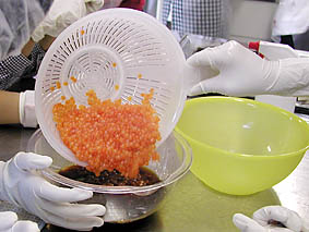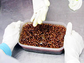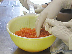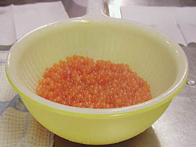 いよいよスジコを調理する 1匹から取れる卵の数は3000〜4000個にもおよぶ 一つひとつにもみほぐせたら3%の食塩水でよく洗う ていねいにゴミなどを取り除く ざるに上げ水を切ってイクラらしくなってきた 調味液(醤油1カップ・酒1/2カップ・みりん少々)に浸して 3〜5分間かきまぜる 密閉式の容器で冷蔵庫に保管 一晩寝かせると味が落ち着き美味しくいただけるイクラとなるのだ ←前へ もどる↑ 次へ→