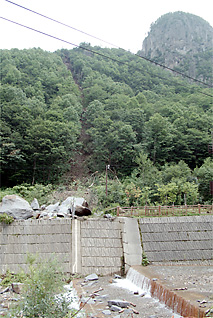 2003夏・罪滅ぼしの旅 ― 運転手+添乗員+カメラマン ― 阿寒への恐怖体験 昼頃には層雲峡に下りてきた。ロープウェイの篭から出る際、目に入ったのが新しい落石であった。大きな岩が砕け、川岸の柵や駐車してある自動車がメチャメチャに壊れている。8/10の早朝5時半頃、雨で地盤が緩んだ斜面をごろごろと落石したらしい。この台風10号の影響で日高・十勝地方など、北海道にもかなりの被害が出たが、この落石も台風の影響だ。大自然の力の前に成す術なしという様だった。気を取り直して昼食に麓のラーメン屋でバターコーンラーメンを注文する。これから最終宿泊地の阿寒湖畔に向かうのである。ここで予想もしない恐怖の体験をすることになった。
