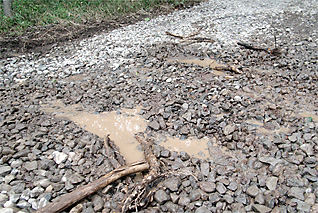 そんなことを同乗者に説明して下車を命じる。全員で押しながら一度目の脱出は失敗。二度目は小枝を前輪(FFである)の前に押し込みトライ、これまた失敗。全員泥だらけになって砂利を素手で掘るもシャーシは砂利に接してつかえている。どこかで動物に見られているような錯覚を振り払って押すも三度目の失敗。今度失敗すれば車輪は深く落ち込む。最後のチャンスと心に誓いながら四度目に満身の力を振り絞って押す、奇跡的に脱出できた。喉はカラカラ、体中の力は抜け、目は点になった。何とか動きだしたレンタカーも泥まみれ、構うことはない、上足寄の里まで20分の道を猛スピードで下りたのだった。