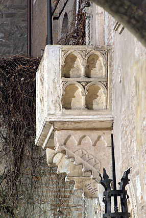 ヴェローナと言えばシェイクスピアの「ロミオとジュリエット」の舞台になった街だ。「ロミオとジュリエット」の物語は 13-14 世紀にヴェローナを二分していた教皇派(グェルフ)と皇帝派(ギべリン)の争いが原因で起こった悲劇だ。もともとは皇帝派の都市だったヴェローナは神聖ローマ帝国に対抗していた。教皇派として自主権を認めさせた後に、再び皇帝派に戻った歴史がある。ロミオの家である教皇派のモンテッキ(モンタギュー)家とジュリエットの家である皇帝派のカプレーティ家(キャピュレット家)は、ダンテの「神曲」の中にも登場している。