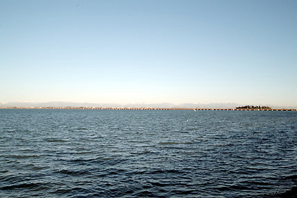 本土側と列車やバスで渡る長い鉄橋(今渡ったばかり)を望む