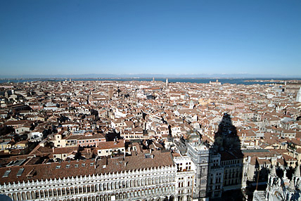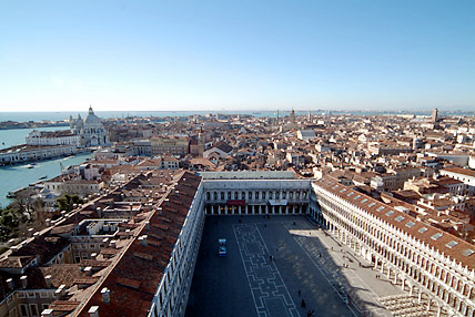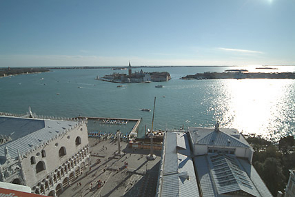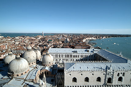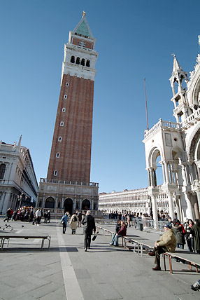 9世紀に海の見張り台として建てられた鐘楼(カンパニーレ)はその後、何度も再建が重ねられるが、現在のものは1910年ごろ再建されたもの。これは1902年に突然鐘楼が崩れたため元通りに再建された。高さは96メートルあり、展望台までエレベーターで上ることが出来る。ヴェネツィアを一望してからの散策が賢明だ。