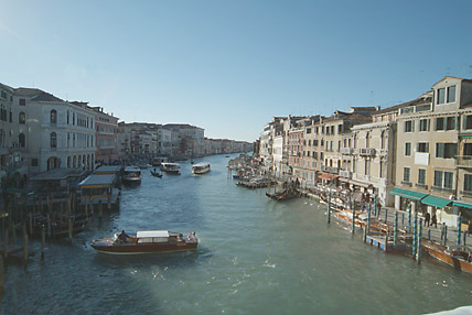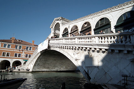 地図上で見ると、ヴェネツィアの中心地に位置しているリアルト橋。サンマルコ広場が政治と宗教の中心地であるのに対してリアルト橋一帯は経済の中心地であった。現在でも生鮮市場、魚市場、土産物店がぎっしりと軒を連ね、観光客だけでなくヴェネツィア人たちも集まる界隈だ。12世紀までは橋と言えるものではなく、船をつないだ渡り廊下のようなものが設置されていたようだ。16世紀までの間に何度か木の橋が架けられたが、崩れたり火災に遭うなどで、現在ある石の橋は16世紀末に建築家ダ・ポンテによって設計されたものだ。橋は3列に分かれ、大運河を見渡せる両側の通路と中央には店が建ち並んだ中央通路がある。