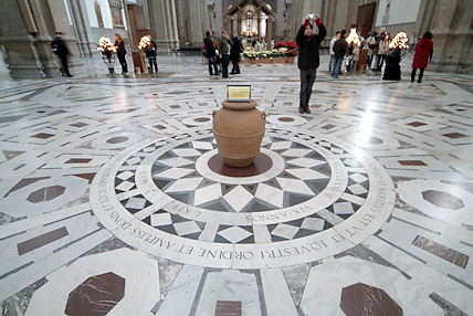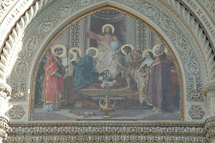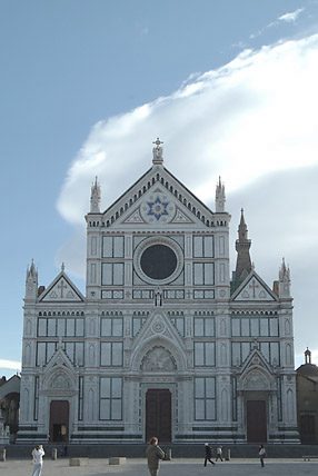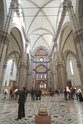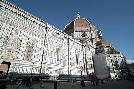 ルネッサンスの発祥の地であり「花の都」と呼ばれるこの街はふとした街角の光景からも芸術の香が漂ってくる。街中が文化遺産そのものだ。その街の中心がドゥオモであることを疑う者はいないだろう。ジョットとその弟子ピサーノによって設計され14世紀後半に完成したジョットの鐘楼も目を引いた。その美しさはフィレンツェを追われたダンテも「神曲」の中で触れている。高さは84メートル、白、ピンク、グリーンの大理石で造られている。塔の下段を飾る六角形のレリーフパネルには、人間の再生の過程が繊細に描かれているが、オリジナルはドゥオモ美術館に収蔵されている。塔の東側にある414段の階段を上れば、美しいドゥオモの姿とフィレンツェの街が一望できるのだが時間がない、次回に再訪した際には是非上ってみたものだ。ドゥオモ内部は圧倒的な外観とは対照的に落ち着いて広さを感じさせなかった。ドゥオモ入場の後は解散場所に移動をした。