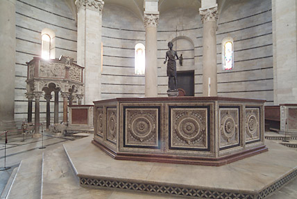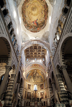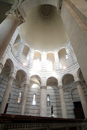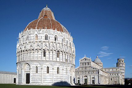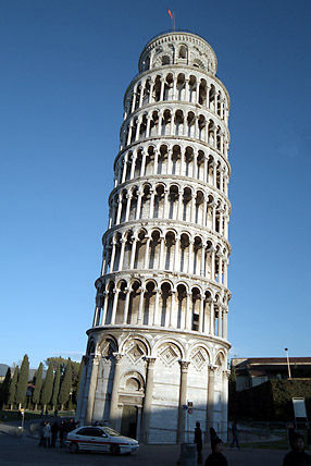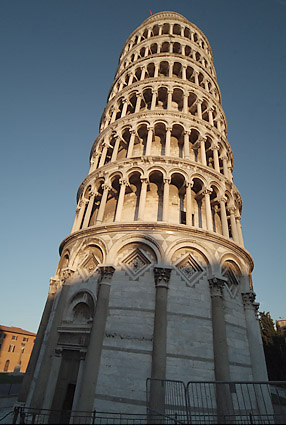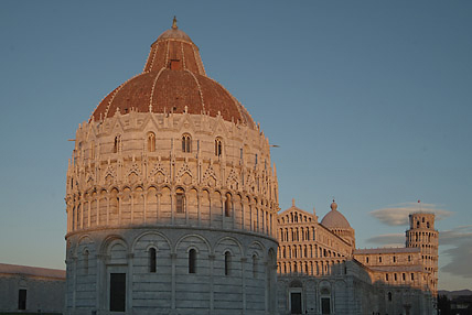 午後はフィレンツェ中央駅の東側、アドゥア広場から現地ツアーのピサ半日観光に参加した。余りにも有名な斜塔は1173年、ボナンノ・ピサーノによってドゥオモの鐘楼として着工された。しかし地盤沈下のため完成したのは14世紀後半であり、塔の中心軸を調整しながらの建築となった。この塔で16世紀にガリレオが「落下の法則」の実験を行ったのは有名だ。斜塔の高さは北側55.2メートル、南側54.5メートルで南に約0.7メートルほど傾いている。現在は塔に登ることができるが時間が許さないので断念。ティレニア海沿いピサに向かってトスカーナ地方の田園風景を車窓から楽しみながらの1時間。広々とした緑の芝生から見上げる斜塔の美しさとともに斜塔にかかる斜影と刻々変化する夕焼けを眼に焼き付けてフィレンツェに戻った。