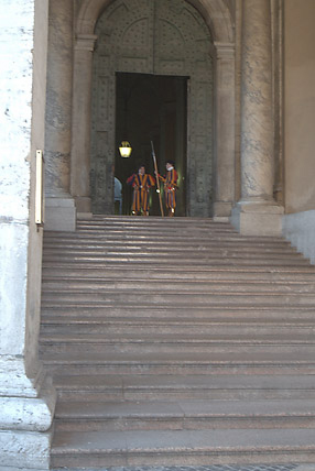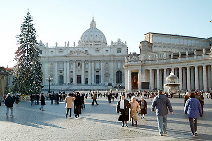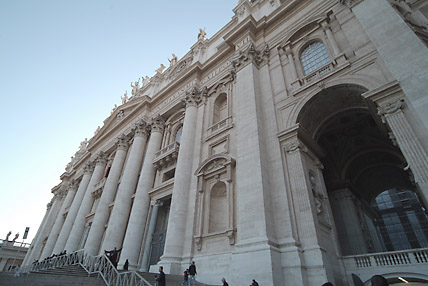 太陽道路からローマ環状線を経て、ようやく市内に入った。まず訪れたのはイタリアの首都ローマにあるキリスト教最大宗派カトリックの総本山、サンピエトロ寺院に向かう。世界最小国家バチカン市国だ。バチカン市国の面積は44ヘクタール。これとほぼ同じ面積といえば東京ディズニーランドくらいである。世界中のカトリック教徒を率いるローマ法王(教皇)は中世ヨーロッパで絶大な権力を持ってた。1929年ムッソリーニと法王の間で「ラテラノ条約」が締結されローマ法王の領土としてバチカン市国が誕生した。使徒ペテロの墓の上にうち立てられたこの宗教国家は、2000年にわたって西欧精神の中軸として絶大な影響力を保持しながら世界に君臨してきた。現在その信徒数は10億人に達している。サンピエトロ広場中央には、西暦40年にエジプトから運ばれた高さ25.5mのオベリスクがあり、周辺の円柱の上部には140人にも及ぶ聖人像がある。聖人ペテロ(サン・ピエトロ)はこのあたりで逆十字架にかけられたといわれている。多くのシスターや信徒、観光客で賑わうサンピエトロ広場を訪れた。その迫力で圧倒されながら聖堂内部に入ったのだ。