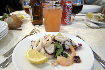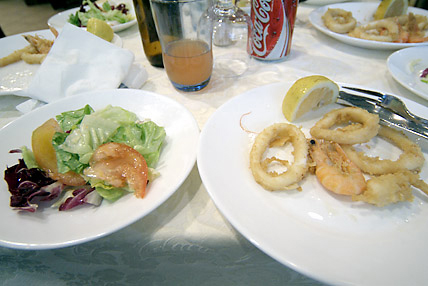 ポンペイに到着するや否や昼食だった。一番の感動は南イタリア産、搾りたてのフレッシュオレンジジュース、4ユーロだ。さっぱりした甘さは柑橘系であることを忘れさせてくれる。最後のフライは油濃さ満点である。蛇足だが地中海性の暖流によって海も海産物も磯の香は全くと言っていいほどに感じない。腹拵えの後は、いよいよ目の前のポンペイ遺跡だ。