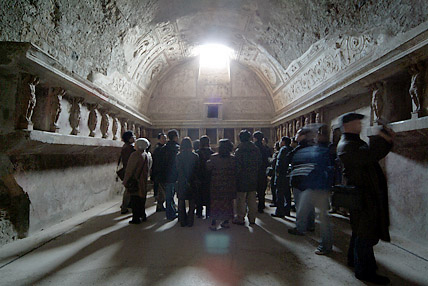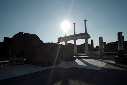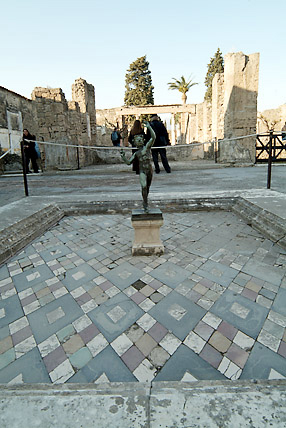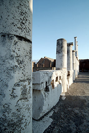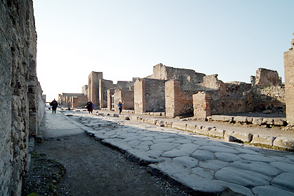 西暦79年当時の街並が驚くほど生々しく残っている。この街ポンペイは長い間人々の目の前から消え、忘れ去られていたのである。2000年前のローマ帝国華やかなりし市民生活がそのまま発掘・展示されていた。道路は石で舗装され、中央は車道(馬車道)で両サイドには一段高くなった歩道がある。鉛製の水道管が道路に埋め込まれた水道設備が完備しており、随所に噴水がある。浴場は男女別々に左右に配置され、二重構造の床で保温の配慮がされた立派な施設だ。猛犬注意の表示など現代と何ら変わらない生活ぶりが伺えた。16時30分にはバスでローマに向かった。道中に運転手が2度のアンコールに応えて歌ってくれたカンツォーネ(曲順はオーソレミオ・サンタルチア・帰れソレントへ)が忘れられない。