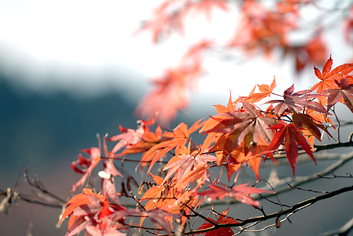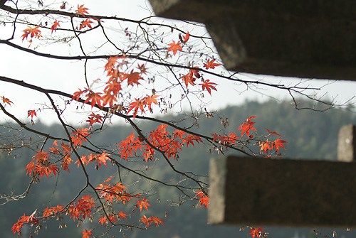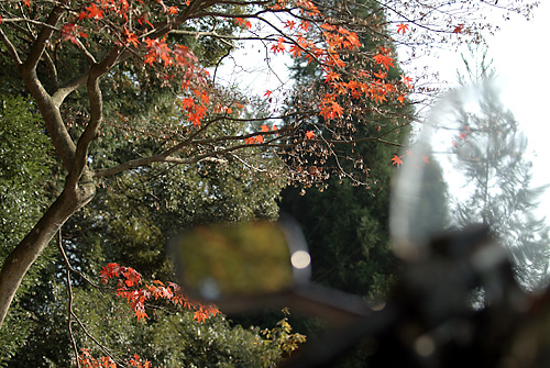 里山の秋-2/2 第2ラウンドは少し下って里の神社で停車した。もみじに出会えた喜び。何度もシャッターを切るが、うまく撮れない。絞り2.8の被写界深度は極めて浅い。それだけに楽しみでもあるが苦しくも感じる。納得する頃には疲れ果てていた。午後2時だ、そろそろ家路に向かおう。