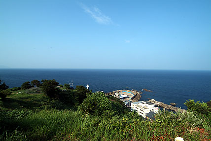 集落のはずれに傾斜の急な階段がある。それを5分ばかり昇ると、丘の上に猫の額ほどの畑に囲まれた小さな灯台がある。日本海の向こうには敦賀半島がかすみ、碧を分ける水平線が僅かな湾曲を描いている。敦賀を出港した苫小牧行の新日本海フェリーが左から右へゆっくりと進む光景に時折出会う。額の汗を拭いながら見下ろす眺めも、これまた変わることがないのだ。