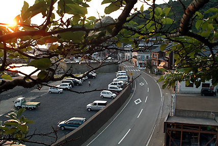 海岸線の道路に夕日が沈みゆく越前町HP もどる↑
