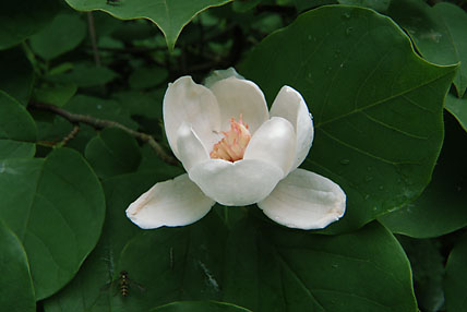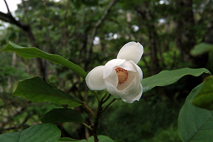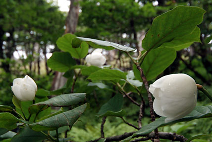 弥山から八経ヶ岳への道で残り僅かなオオヤマレンゲ(モクレン科)と出会うことが出来た。間に合って良かったとシャッターを切る。周囲は鹿の被害から守るためのネットが張り巡らされている。登山道がネットの切れ目にかかると必ず鉄製の扉がある。いくつも潜っていくうちに扉で頭を打ってしまった。下山後1週間経ってようやくコブが取れてきた。こんなに苦労しなければ見られない花だけに人知れず咲く姿が印象深い。