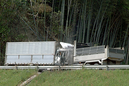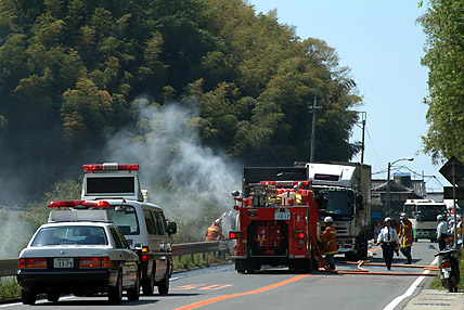 午前中には和歌山港から出港したい予定していたが、御所市から五條市に向かう丘陵地帯の峠に差し掛かったところでサイレン音とともに何台もの消防車とパトカーに追い越された。程なく大渋滞に巻き込まれ、前方で激しく煙が上がっている。先頭まで行ってみると交通事故で上り下りともに通行止めであることが判明。10分くらいは待ってみたが横の細い抜け道まで戻り、何とか抜け出すことが出来た。