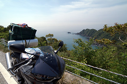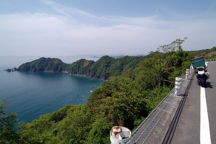 宇佐大橋を渡ると右に浦ノ内湾、左に太平洋を望む横浪黒潮ラインに入る。切り立った断崖には海と空の青に対して春の新緑が眩しいコントラストを浮き立たせていた。程なく国道56号線に戻り、しばらくは太平洋と別れて峠道になる。七子峠を越えると再び太平洋に出た。
