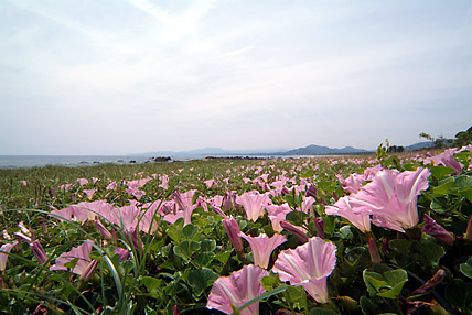 土佐白浜海岸には浜昼顔がびっしりと一面に咲き誇っている。昼下がりの強い光線ではあったが気温は25度以下であろう。元気な花を真上に向けて人知れず開いている様が一際力強く感じた。四万十川の河口が開く街、中村市も目の前だ。