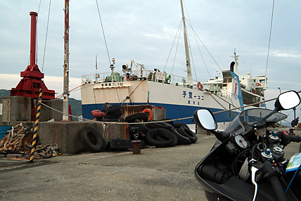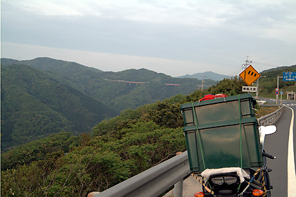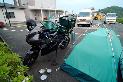 これでも遠慮して駐車場の最も奥にテントを設営したににも関わらず、午前4時頃には九州ナンバーのトラックやワゴン車などが続々、エンジン音とともに「オーライ、オーライ」なんて叫んでいる。こうなれば静かに寝ていられるものではない。仕方なくバーナーに火を付けて朝食の準備に取り掛かった。全く前夜の室戸岬キャンプ場とは雲泥の差、もっとも使用料は払う必要がないのだが....。5時20分にはテントを収納して出発、三崎町を目指して一路西へ向かう。