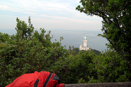 30分くらいであろうか、思いのほか長く走った。三崎町を通過して四国の最西端の佐田岬の駐車場まで到達した。ここからは徒歩で1.4kmある遊歩道だ。早朝の散歩にしてはアップダウンが厳しい。いつしかジャケットも脱ぎ捨てて息を弾ませていた。灯台から海原遠くに九州がかすんで見えた。あぁ、ここまで来たのか....と、しばし茫然。休む暇もなく駐車場へ戻った。