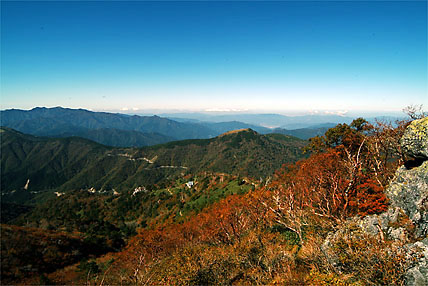 秋の剣山単独幕営初体験-2 尾根道を進めていくうちに眺望も次第に開けていった。南斜面には広葉樹の紅葉が美しく、その南斜面越しにはジロウギュウ(1929m)の容姿が現れた。頂上が近付くにつれてクマザサが目を引く。ようやく1時間の道程で頂上に達することができた。なだらかな平地で、よく整備された木道がクマザサの成育を助けている。快晴の四国山脈を西に一望できる絶景が手に入った。それにしてもザックの重さには閉口してしまった。