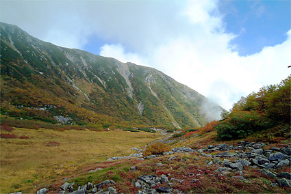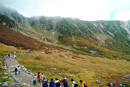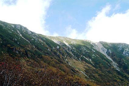 '05初秋の信州駒ケ岳-2/4 雨に降られて傘をささねばならない可能性は無いようだ。すっかり秋の色に衣替えを済ませた千畳敷カールを満喫できた。集合時間が昼食も含めて13時30分と決められた。登ってみたい道が眼前に一筋伸びている。ともかく弁当とカメラを携えながらカールの遊歩道を外れて登山道目指して行けるところまで行ってみる。