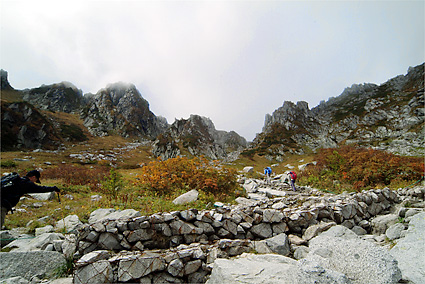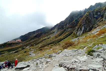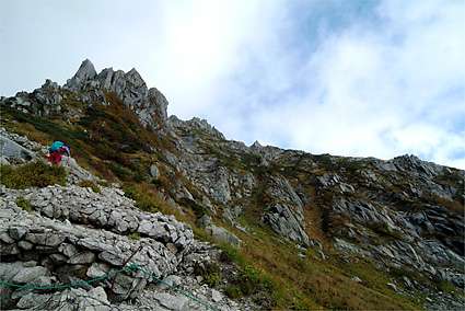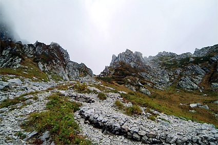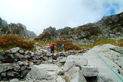 '05初秋の信州駒ケ岳-3/4 中岳の方向に伸びる登山道に自然と足が向く。時間が足りない。昼食を済ませて残された時間と相談しよう。登山道の中腹で弁当を広げながらカールの眺望を楽しんだ。心残りだが中岳は次回に譲るしかなさそうだ。やっぱり秋の山は色彩的にも美しく、清涼な空気もすこぶる快感である。京都のような盆地では日頃見ることのできない視界の広さも中央アルプスの魅力だ。