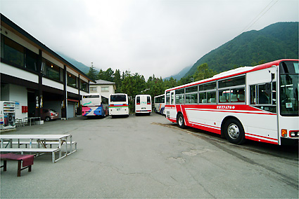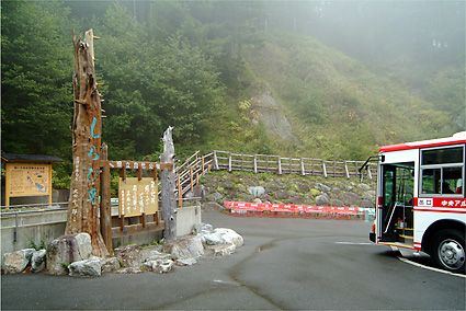中央アルプス観光の路線バスでロープウェイの「しらび平」駅到着