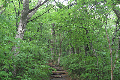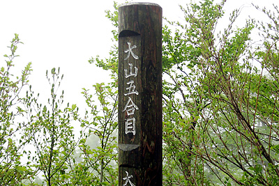 ―風雨との闘い― 鏡ケ成から自動車で約30分、大山寺の前にある夏山登山口を入る。朝9時頃には折りからの豪雨が止んだ。何とか登れそうである。しかし八合目を過ぎる尾根道になった頃から風雨が強まった。風速は30mから40mはあろうか、カメラはヤッケ内で結露。撮影不能だ。雨で滑る木道はロープが張られていない箇所もある。何度も突風で転倒しそうになる。昼食も取れずに下山することとなった。
