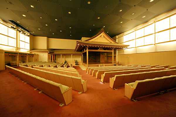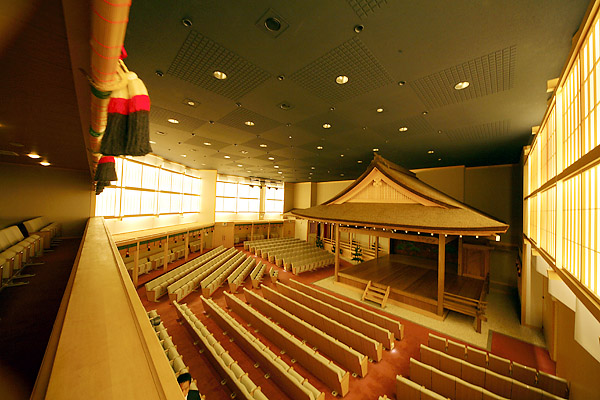 百三十余年の星霜を経た室町の旧金剛能楽堂より、先人の思いが詰まった能舞台をそのまま移築。21世紀の能楽堂の中に19世紀の舞台が融合する空間だ。 座席数は定席が420席、補助席80席、ここで狂言を鑑賞したのだ。