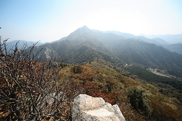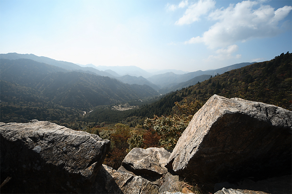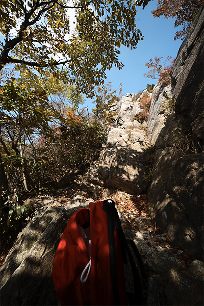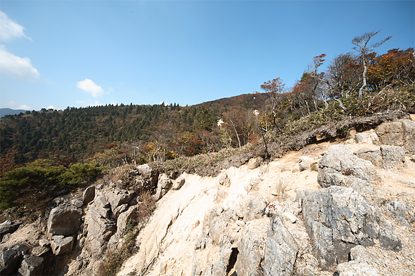 傾斜がきつく、奇岩と絶壁の連続だ。四肢を使ってよじ登っていく箇所に何度も阻まれる。 次第に周囲の木々が紅葉している景観に変化し、見上げれば大きな社が見えてきた。岩に時折スプレーで書かれた数字で何合目かが分かる。