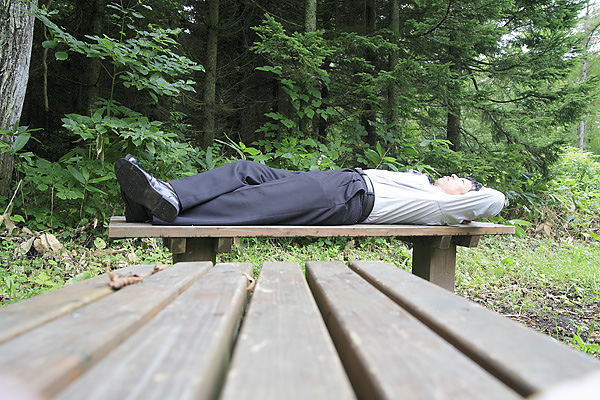 分岐点にはベンチがあった。8月末といっても気温は25度、まだまだ暑い盛りだ。歩き疲れて座り込む、そしていつしか横になっていた。何とも気持ちが透き通っていく極上の感触。