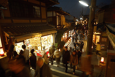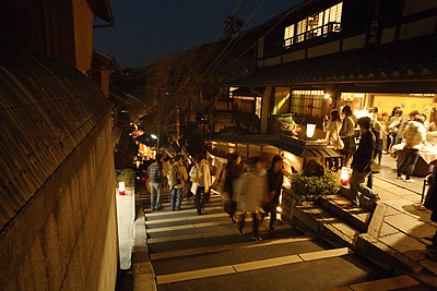 ―待ちわびた春― 2008年3月16日、早春の宵を飾る風物詩「京都東山花灯路」に出かけた。歴史の香り豊かな東山の麓。北は青蓮院、円山公園から八坂神社を通って、清水寺までのおよそ4.6kmの道だ。白壁や土塀、石畳が続く風情ある散策路が、和の「灯り」と「花」で彩られている。今回は京阪五条から東へ、五条坂を通って産寧坂を目指した。