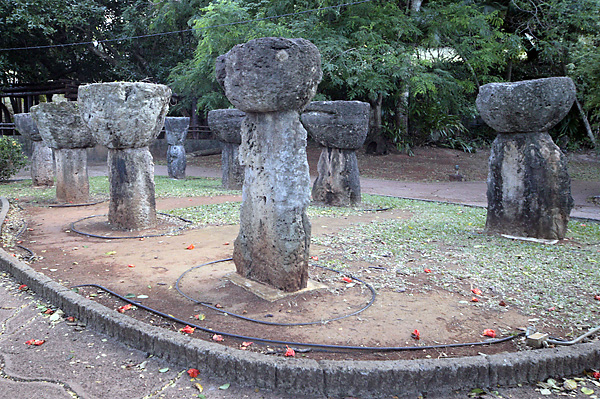 まずは島内最大のスーパーマーケット、Kマートで買い物だ。続いてグアムの首都ハガニャのラッテ・ストーン公園に向かった。そこで見られたラッテストーン(Latte stone) とは、グアム、サイパンなどマリアナ諸島に見られるサンゴ石でできた石柱群である。ラッテ・ストーン公園には、1.5mほどの高さのものが6本ずつ2列に並んでいた。ラッテ・ストーンが何に使われたものなのかは、17世紀後半のスペインによるマリアナ諸島の侵略によって、古代チャモロ文化が途絶えてしまったのでよくわかっていない。