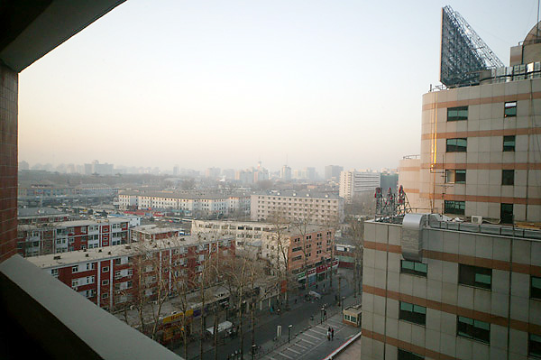 翌朝7時の窓を覗くと真っ暗だ。緯度が高い事を実感しながら8時まで待つも、その眺望はやや霞んだものだった。眼下のアパートに出向いてみた。北京市民の出勤時間だ。地価は日本より高く、70年後には政府に返納する借地権である。土地の所有は認められていないので、アパート住まいが多いのだろうか。