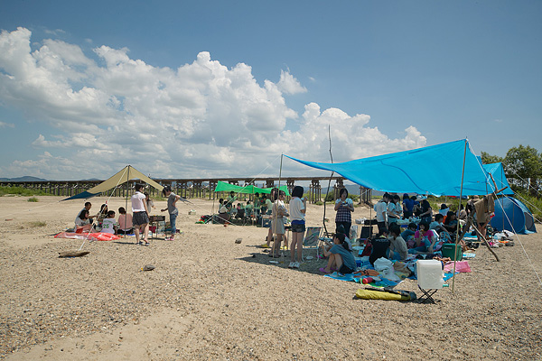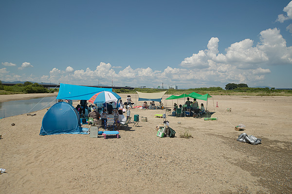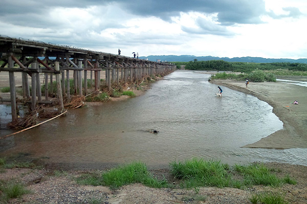 2012年8月、手近な八幡市上津屋橋(流れ橋)の袂でデイキャンプを実行するため出かけた。13日の夜半に大阪から京都府南部にかけて集中豪雨があり、宇治市志津川地区などで甚大な被害が出た。もちろん木津川も最大級の水量だったが、収束方向の8月15日、水嵩チェックのため流れ橋に立ち寄った。もう大丈夫だと判断。適度な支流があって、穏やかな風景であった。