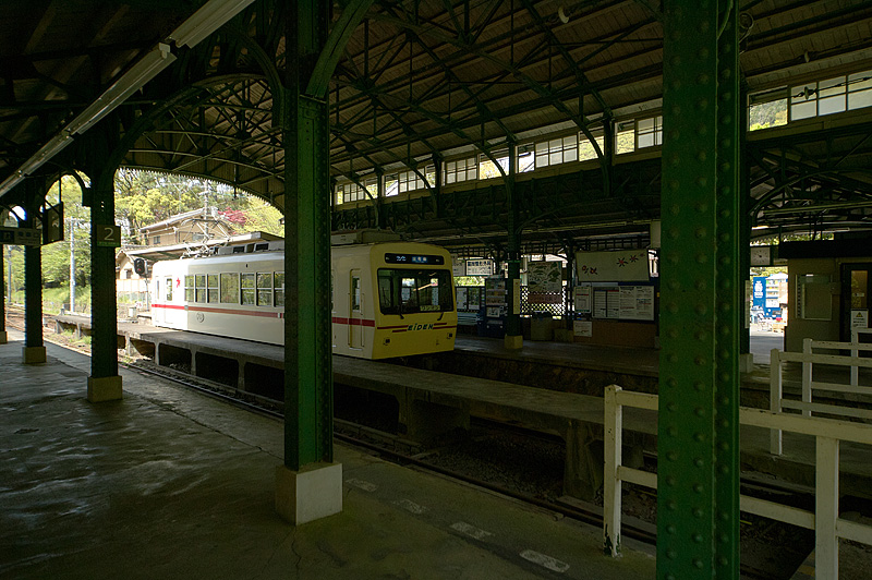 2012GW点描2/3 2012年4月29日、八瀬BBQに赴いた。筆者が小さい頃に八瀬遊園地のプールに入り、その冷たさに驚いた記憶がある。八瀬遊園地といえば叡山電鉄の前身、京福電鉄の開通(大正14=1925年)とともに開業した遊園地で比叡山ケーブルが山頂まで通じていて、当時は多くの家族連れで賑わいを見せた。 現在はエクシブ京都八瀬離宮というホテルになっている。八瀬比叡山口駅は八瀬遊園地の閉園に伴い、2002年(平成14年)に「八瀬遊園」から現駅名に改称されたが、開業以来からの木造駅舎と、終着駅に特有のドーム状の屋根がかつての栄光を偲ばせる趣深い駅舎だ。