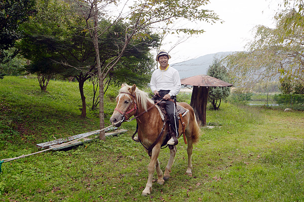 公園を散歩に訪れたのは馬だった。飼い主に「乗ってみますか?」と誘われ、跨ってみた。2歳の雌馬、名前はマイちゃん。大変おとなしく可愛い子だ。昼食を済ませて、ご主人宅を訪問した。マイちゃんとの再会を果たすべく行ったのだが、犬をはじめ山羊や豚に兎、さながら動物園だ。羨ましい自然との共存を味わい、帰路に着いた。