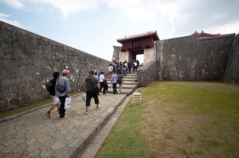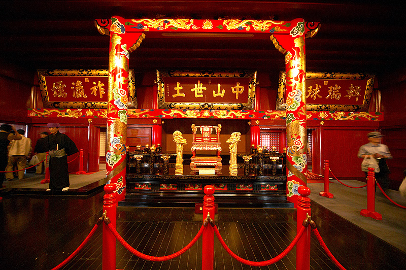 守礼門は残念ながら修復中だったが、首里城公園の世界遺産は他にある。そう、その一つが園比屋武御嶽石門(そのひゃんうたきいしもん)だ。いくつもの門をくぐりいよいよ正殿だ。戦いを好まない琉球島人の歴史を偲ぶことのできる空間だ。