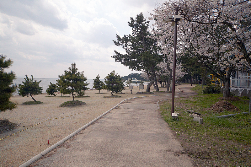 マキノ町といえば海津大崎の桜並木。昭和11年(1936)6月に大崎トンネルが完成したのを記念して海津村が植樹したもので、奥琵琶湖に春の訪れを告げる代表的な風物詩である。例年4月中旬には延長4kmにわたって約600本のソメイヨシノが咲き誇る。今回は残念ながら、マキノサニービーチから遠くに眺めるだけとなってしまった。