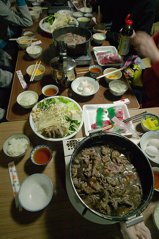 歴史を感じさせる土蔵が印象的な民宿「幸乃家」で夕べの宴は、すき焼き鍋だ。思わぬ寒さも、ほころぶ味わい。山の里に絶品の温もりを頂戴した。翌朝は朝日が眩しいお地蔵様に「おはようございます」とご挨拶。